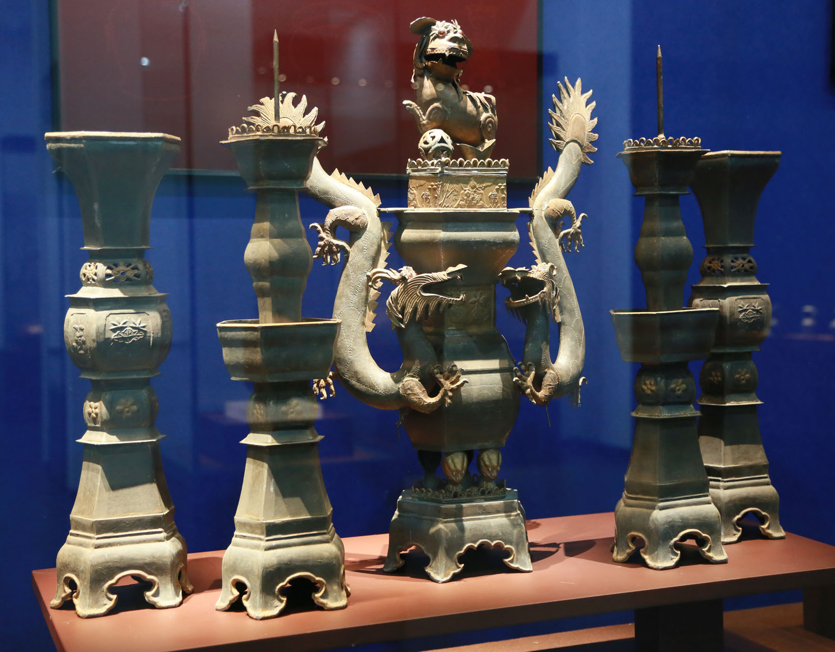 民国 左一右一:锡制开窗花卉纹鎏金花觚 左二右二:锡制多层局部鎏铜烛台 中:锡制狮首双龙鎏铜香薰